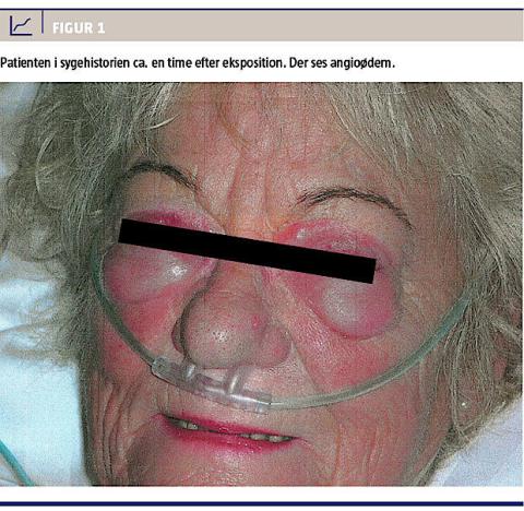 torium. Under en behandling i sårambulatoriet blev hun for første gang nogensinde behandlet med Prontosansårskyllevæske og sårgel. Allerede et par minutter efter første applikation af Prontosan klagede hun over kløe og ubehag i øjnene. Man fortsatte behandlingen med Prontosan og efter yderligere 25 minutter fik hun varmefornemmelse, blussende og kløende hud, følelse af alment ubehag, åndenød (astmatisk vejrtrækning) og diffust angioødem (især periorbitalt) (Figur 1). Inden for få minutter blev hun behandlet med intravenøst indgivet saltvand, steroid og antihistamin, beta-2-agonistinhalationer og sanering af såret. Hun blev ikke behandlet med intramuskulært indgivet adrenalin, og hun var på intet tidspunkt bevidsthedspåvirket. Hendes blodtryk og puls blev ikke målt.
