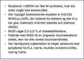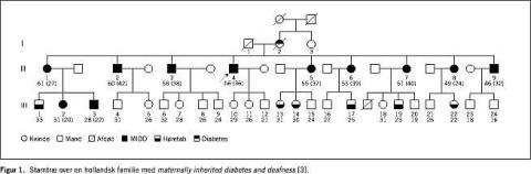 I denne artikel beskrives aktuel viden om diabetes forårsaget af mutationer i det mitokondrielle DNA med fokus på den hyppigst forekommende: punktmutationen mtDNA A3243G, tRNA, Leu (UUR), der bl.a. kan give syndromet maternally inherited diabetes and deafness (MIDD). Klinisk er MIDD kendetegnet ved maternel arvegang, udvikling af perceptivt høretab og diabetes med en progressiv insulinsekretionsdefekt samt store forskelle i den fænotypiske præsentation. I udenlandske studier angives MIDD at udgøre 0,5-2,8% af alle diabetestilfælde. Patienterne synes initialt at have en svækkelse af glukoseinduceret insulinsekretion frem for en insulinresistens, dog er den tilgrundliggende patofysiologi kompleks og kun delvis beskrevet. Diabetespatienter med hørenedsættelse og/eller maternel disposition for samme kan eventuelt screenes for mutationen. Hvorvidt MIDD-patienter får særlige senkomplikationer eller i øvrigt skal behandles efter andre retningslinjer, er på nuværende tidspunkt uvist.