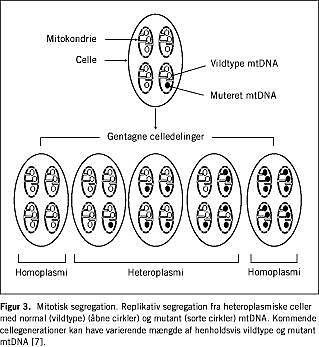 Celler med patogene mutationer har derimod oftest intracellulær sameksistens af både patogent muteret og vildtype mtDNA i varierende ratioer. Dette begreb kaldes heteroplasmi (Figur 3 ).