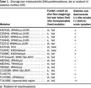 Wolframs syndrom, karakteriseret af diabetes insipidus, diabetes mellitus, optisk atrofi og døvhed (DIDMOAD), er oftest en autosomal recessiv lidelse forårsaget af mutation på kromosom 4p16, men kan ligeledes forårsages af mtDNA-rearrangement [30]. Herudover har man kendskab til en række punktmutationer i mtDNA, der er relateret til DM (Tabel 1 ). På nuværende tidspunkt er de fleste beskrivelser kasuistiske, og der foreligger ikke større epidemiologiske undersøgelser af disse.