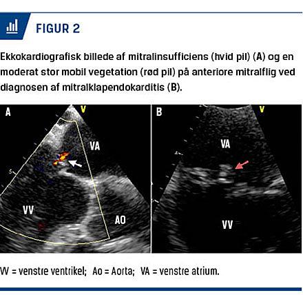 Efter 20 dage viste PCR fra corpus vitreum E. faecalis-infektion. Patienten blev indlagt akut, der blev taget blodprøver samt foretaget bloddyrkning og urindyrkning, og man påbegyndte intravenøs behandling med vancomycin, da man ikke kendte resistensmønsteret. Fraset synstabet havde han ingen gener. Ved en objektiv undersøgelse fandt man patienten upåvirket (temperatur på 36,1 °C). Ved stetoskopi af hjertet hørtes ingen mislyde. Blodprøveresultater ved indlæggelsen var normale (leukocytniveau: 4,7 × 109/l, C-reaktivt protein-niveau: 7 mg/l). Der blev ikke påvist bakterievækst i bloddyrkningerne. Man valgte på grund af bakterieætiologien at henvise patienten til transøsofageal ekkokardiografi (TEE) (Figur 2) for at udelukke endokarditis. TEE’en viste mild mitralinsufficiens med en moderat størrelse, meget mobil og flagrende vegetation på den anteriore mitralklap og en normalt udseende pacemakerelektrode i højre atrium. Behandlingen blev ændret til endokarditisbehandling med intravenøst givet ampicillin 3 g × 4 i seks uger og gentamicin 240 mg × 1 i de første to uger justeret efter S-gentamicin [3]. Herefter blev patienten henvist subakut til Rigshospitalet til fjernelse, sanering og reimplantation af pacemakeren pga. klinisk mistanke om infektion på denne. Der blev ikke foretaget PCR, men dyrkning af pacemakerledningen viste formodet forurening med Propionibacterium acnes som eneste fund. Ved kontrol-TEE