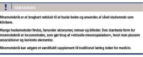 Udenadslære og forelæsninger er klassisk set ufravigelige elementer på medicinstudiet, men effekten på læring er lav, og der er plads til forbedringer, især med hensyn til aktivering af de studerende. Når man ser på den gennemsnitlige evne til langtidsgenkaldelse efter omhyggelig og repetitiv terpning, virker flere af de her beskrevne husketeknikker som gode alternativer.