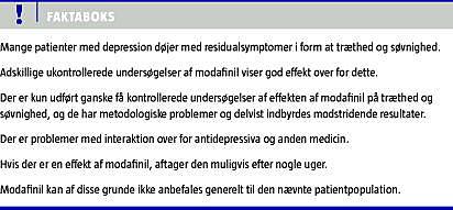 Summary Modafinil in the treatment of depression - a systematic review Ugeskr Læger 2012;174(6):348-351 A systematic review of the literature on modafinil as adjunctive treatment to antidepressants in patients with major depression and residual symptoms of fatigue and drowsiness is presented. Several open-labelled studies have shown good results on treatment with modafinil. However, only a few randomised controlled clinical trials exist. These have methodological weaknesses and their results are contradictory. If modafinil is used in highly selected patients with severe fatigue its potential interactions with antidepressants must be borne in mind. Furthermore, discontinuation of the drug should be tried after a couple of months, as one study suggests that the effect wears off. In addition, the drug is rather expensive.