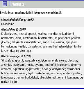 Nettoresultatet er således, at vågenheden øges, men modafinil adskiller sig væsentligt fra andre psykostimulantia ved at være selektiv for specifikke områder i centralnervesystemet frem for generelt at aktivere, som amfetamin og lignende stoffer gør det. Modafinil har derfor ringe effekt på den dopaminerge aktivitet i striatum (se f.eks. [5]), og der er minimal risiko for misbrug af stoffet [6]. Der er således flere teoretiske grunde til at forvente en gavnlig effekt på depression eller depressive restsymptomer - specielt træthed, anergi og kognitiv dysfunktion. Bivirkningerne ved modafinil er vist i Tabel 1 .