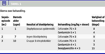 En pige blev født ved en gestationsalder på 29+2 uger ved subakut sectio pga. svær væksthæmning. Fødselsvægten var 675 g. På 8. dagen opstod stimulationskrævende bradykardier. Pigen behandledes med cefuroxim og gentamicin (C+G) (Tabel 1 ). C-reaktivt protein (CRP) steg fra ti til 100 mg/l. Bloddyrkning (BD) viste Staphylococcus epidermidis , der blev tolket som forurening fra navlevenekateter. Patienten overflyttedes herefter til stamsygehus.