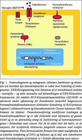 Tyrosinkinaserne er den største gruppe af dominante onkogener, og somatiske mutationer i denne gruppe af gener forårsager en stor fraktion af cancere hos mennesker (3). Den transformerende effekt af receptortyrosinkinaser (RTK) skyldes øget eller konstitutiv kinaseaktivitet med en kvantitativ eller kvalitativt ændret nedenstrømssignalering. Et klassisk eksempel på RTK's rolle ved cancer er NEU/ERB-B2 og EGF-receptor-overekspression i bryst- og lungekarcinomer. ERB-B2-signalering kan hæmmes af et monoklonalt antistof - herceptin - og dette anvendes ved behandlingen af ERB-B2-positive brystcancere. En selektiv EGF-R-tyrosinkinaseinhibitor (ZD1839) er ydermere under afprøvning ved fremskreden småcellet lungecancer. Cytoplasmatiske tyrosinkinaser er også involveret i forskellige cancere hos mennesker. Kronisk myeloid leukæmi (CML) forårsages således af en specifik translokation - det såkaldte Philadelfia-kromosom, som omfatter nonreceptor-protein-tyrosinkinasen c-ABL på kromosom 9 og BCR-genet på kromosom 22. I kernen medvirker c-ABL ved DNA-skade-induceret apoptose, men BCR-ABL-fusionsproteinet kan ikke mediere denne funktion, fordi det tilbageholdes i cellens cytoplasma. Man har i en årrække forsøgt at udvikle selektive hæmmere af tyrosinkinaser, og i 1996 fandt man STI571 (Gleevec™) (4), som viste sig at være en specifik blokker af BCR-ABL-fusionsproteinet. STI571 kan ikke blot hæmme væksten af BCR-ABL-transformerede leukæmiske celler, men inducerer også apoptose af cellerne, idet BCR-ABL transporteres ind i kernen. STI571 fremkalder remission hos ca. 50% af CML-patienterne, og på grund af kinasehæmmerens udtalte specificitet er der få bivirkninger i forbindelse med denne form for kemoterapi.