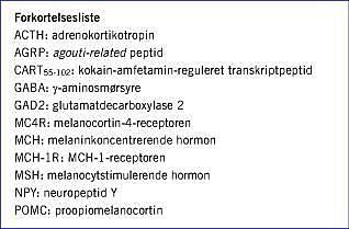 De identificerede monogene former for fedme, hvis patofysiologiske mekanismer i vid udstrækning kan forklares gennem hypotalamisk dysfunktion, kan klassificeres i to kategorier ud fra deres prævalens: Blandt de sjæl dne typer hører gener, som koder for leptin, leptinreceptoren, POMC, PC-1, og CART [4]. Mutationer i disse fører til ekstremt sjældne tilfælde af oftest recessivt nedarvet svær fedme og en række endokrine anomalier [5]. Mutationer i MC4R -genet er den hyppigste kendte årsag til monogen fedme hos mennesker med en prævalens, der i forskellige studier varierer fra 0,5% til 6,0% [6]. Mutationer i MC4R , som fører til ophævet funktion af receptoren er forbundet med sværere former for fedme, hvorimod fedmefænotyperne ved delvis funktionsnedsættelse af receptoren er mere beskedne. Arvegangen for varianter i MC4R -genet er kodominant, og graden af adipositas, som forårsages af mutationerne skyldes haploinsufficiens. Selv om homozygote bærere generelt er svært overvægtige, er det ikke altid tilfældet med heterozygote bærere. Den varierende penetrans peger på, at der sandsynligvis findes genetiske eller ikke-genetiske modificerende faktorer, som har betydning for fænotypeekspression. I den sammenhæng er det interessant, at der for nylig i MC4R er fundet en aminosyrepolymorfi, som beskytter mod fedme. Personer med MC4R -mutationer er ikke så adipøse som personer med leptinmangel. Børnefedme forårsaget af nedsat MC4R-funktion er kendetegnet ved øget højdevækst, øget mager legemsmasse og en øget knogletæthed.