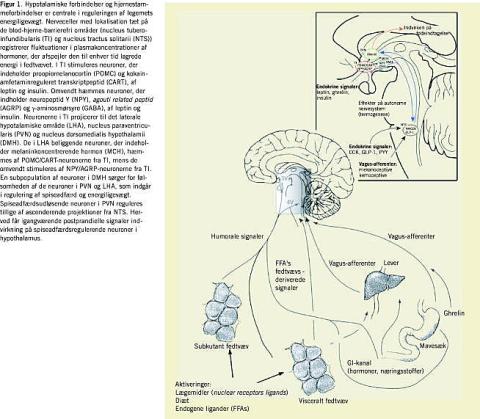 Dyremodellerne konfirmerer hypothalamus' rolle som integrator af såvel hormonelle som neuronale signaler med betydning for energiligevægten. Hypotalamiske neuroner i den tuberoinfundibulære og den ventromediale kerne er følsomme for fluktuationer i plasmaleptin og plasmainsulin, samtidig med at de via ascenderende forbindelser fra nucleus tractus solitarii modtager information om gastointestinalkanalens absorption af makronæringsstoffer (Figur 1 ).