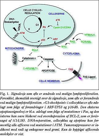 Overgangen fra G1 til S-fase (»G1-checkpoint «) i cellecyklus styres af to overordnede tumorsuppressor-signalveje, p16-Rb samt ARF-TP53 (Fig. 1). Begge hæmmer cyclin/CDK-komplekser og kan derved blokere progression i cellecyklus. Ændringer i disse signalveje forekommer ved mange lymfoide tumorer og er typisk forbundet med et aggressivt forløb. Således er mutationer i TP53 forbundet med histologisk transformation i FL, MALT-type lymfomer og MCL (9), med dårlig prognose ved B-CLL og DLBCL og med relaps af v-ALL. p16-genet er inaktiveret ved metylering i en række tumorer, f.eks. DLBCL, MALT-type lymfomer, MCL, MM og BL. Deletioner af p16 vil i reglen også omfatte ARF , da disse to gener kodes fra samme område på genomet, og ved DLBCL er det vist, at patienter med defekter i både p16-Rb og ARF-TP53 har en langt dårligere prognose end patienter, som kun har defekt i en eller ingen af de to signalveje (10). Nyere studier tyder på, at andre gener, som regulerer cellecyklus, også kan agere som tumorsuppressorer i lymfoide tumorer. Således er CDK-inhibitoren p57 inaktiveret ved metylering i mange B-celle-tumorer, ligesom p15 og p73 hyppigt er inaktiveret ved metylering eller deletion ved v-ALL og er forbundet med dårlig prognose (11).