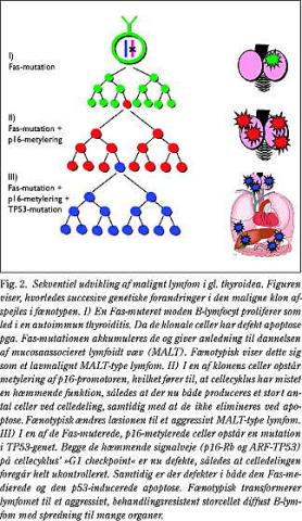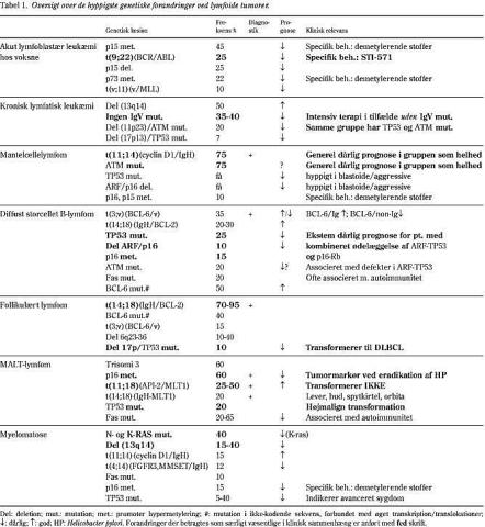 En forenklet fremstilling af nogle af de signalveje, som generne er impliceret i, er vist i Fig. 1 , mens Fig. 2 viser et eksempel på, hvorledes successivt erhvervede genetiske forandringer styrer transformationen fra en normal lymfocyt til et aggressivt lymfom. En oversigt over de væsentligste molekylære forandringer ved udvalgte maligne lymfoproliferative sygdomme er vist i Tabel 1 . Som det fremgår, er nogle ændringer specifikke for bestemte lymfomsygdomme og kan anvendes i diagnostisk sammenhæng. Dette gælder eksempelvis for mange af translokationerne. Andre forandringer forekommer ved mange forskellige typer af lymfom og er primært af interesse i prognostisk/behandlingsmæssig sammenhæng. Dette gælder for mange af de ændringer (deletioner, punktmutationer, metylering), som inaktiverer tumorsuppressorgenerne.