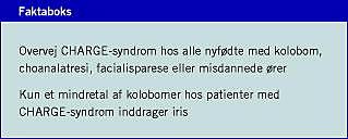 CHARGE ( coloboma, heart defects, atresia choanae, retarded growth and development, genital anomalies, ear anomalies ) er et genetisk heterogent syndrom med mutationer i genet chromodomain helicase DNA-binding protein 7 (CHD7) hos ca. 60% af patienterne. Der er ingen klar genotype-fænotype-korrelation, men flertallet af mutationspositive patienter opfylder de diagnostiske kliniske kriterier. CHARGE-syndrom skal overvejes hos børn med facialisparese, kolobom og/eller choanalatresi; abnormiteter af det indre og ydre øre er af stor diagnostisk værdi.