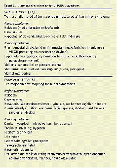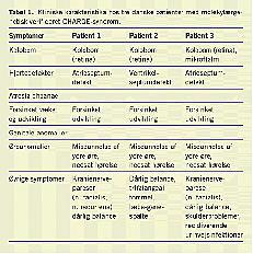 Siden 1981 er de kliniske kriterier for CHARGE blevet revideret flere gange (Tabel 2 ) [5, 11, 12]. Kriterierne stammer fra tiden, før molekylærgenetisk diagnostik var til rådighed. De tre danske patienter opfyldte de diagnostiske kriterier i henhold til Pagon og Blake [4, 5]. De opfyldte ikke Verloes ' kriterier, men dette kan skyldes, at der ikke blev foretaget CT af indre øre. Aplasi/hypoplasi af de semicirkulære kanaler er påvist hos 95-100% af CHD7- mutationspositive patienter, der har fået foretaget CT af det indre øre [8, 9].