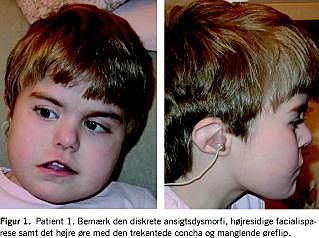 Der var tendens til anfald, specielt om morgenen, hvor hun kunne være motorisk usikker, føle alment ubehag og evt. kaste op. Profylaktisk migrænebehandling var uden sikker effekt. Der blev ikke foretaget CT af det indre øre. Pigen havde en let ansigtsdysmorfi i form af en høj, bred næseryg, næse præget af den tidligere læbespalte, små øjenspalter, spids hage, små ører, hvor specielt venstre var kopformet med overfoldning af helix, prominerende anthelix og hypoplastisk øreflip (Figur 2). Der var nystagmus.