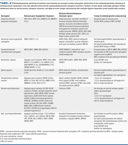 Nedenfor og i Tabel 2 gennemgås kliniske karakteristika, arvegang og molekylærgenetisk udredning for hyppige, udvalgte nyresygdomme.