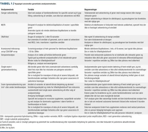 Ved molekylærgenetisk udredning af patienter, hvor man har mistanke om monogen arvelig nyresygdom, kan flere genetiske analysemetoder komme i spil. I Tabel 1 gennemgås fordele og begrænsninger ved analysemetoderne.