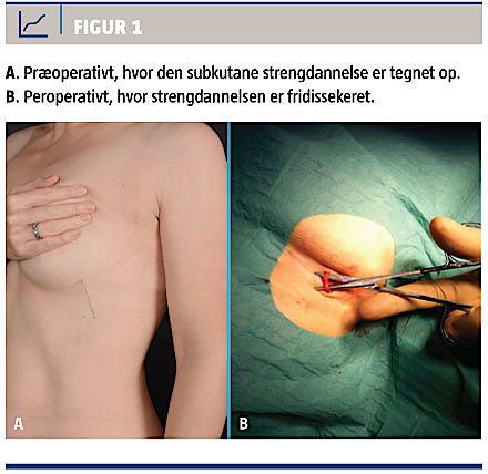 Man overvejede en ultralydskanning af området, men besluttede i stedet at udføre en diagnostisk excisionsbiopsi i lokalanalgesi, hvor man samtidigt direkte kunne se forandringen. Biopsien blev foretaget via en mindre incision i inframammærfuren på tværs af forandringen. En subkutant beliggende strengdannende struktur, der var ca. 3 mm i diameter, kunne fridissekeres. Forandringen lignede mest af alt et fortykket lymfekar eller en tromboseret vene (Figur 1B). Et stykke på 1 cm blev excideret, hvorved det blev klart, at der var tale om en rørstruktur. En patologisk undersøgelse af biopsien viste, at der var tale om bløddelsvæv med uspecifik reaktiv forandring, der var intet malignt.