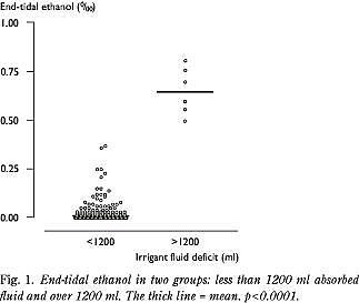 Hyppigheden af absorption over 1.200 ml fandtes i dette studie at være 4% og berettiger til at anvende en monitorering som rutine. Måling af endtidalethanol anvendt som rutine kan ikke anbefales ved vurdering af absorberet væskemængder under 1.200 ml, som hos de fleste patienter ikke er behan dlingskrævende (6).
