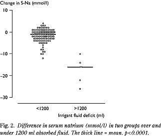 Resultater: Der blev fundet fire patienter med absorption over 1.200 ml. Ved absorberet skyllevæskemængde over 1.200 ml var ethanolmåling lige så pålidelig som serumnatriummangel. Ved absorption under 1.200 ml fandtes serumnatrium og ethanolmåling ikke at være korrelerede til optaget skyllevæskemængde.