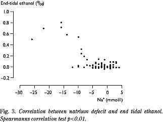 Der blev fundet seks målinger hos fire patienter, hvor absorptionsvolumenet var større end 1.200 ml. Ved alle var endtidalkoncentrationen større end 0,5 (Fig. 1 ), og der var et tilsvarende serumnatriumdeficit på 10 mmol og derunder (Fig. 2 ). Korrelation mellem serumnatrium og alkohol fremgår af Fig. 3 .
