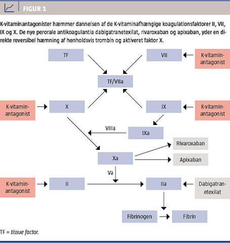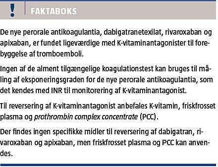 Godkendelsen af de nye perorale antikoagulantia, dabigatranetexilat, rivaroxaban og apixaban markerer en ny æra i antikoagulans (AK)-behandling. Alle tre farmaka er godkendt til forebyggelse af tromboemboli i forbindelse med knæ- og hoftealloplastik samt forebyggelse af tromboemboli hos patienter med nonvalvulær atrieflimren. Rivaroxaban er godkendt til behandling af dyb venetrombose (DVT) og lungeemboli (LE). Dermed udfordrer de nye perorale antikoagulantia det behandlingsmonopol, som K-vitaminantagonisterne (VKA) warfarin og phenprocoumon har haft i årtier.