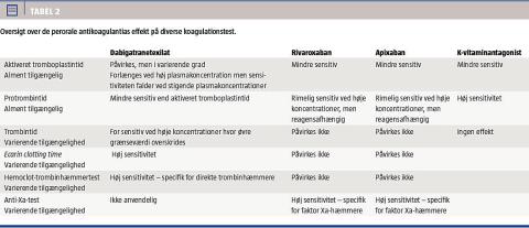 På trods af, at de nye perorale antikoagulantia har et relativt bredt terapeutisk vindue og en hurtig elimination, specielt ved normal nyrefunktion, kan der ved tromboemboliske tilfælde eller blødning være behov for at kunne måle den antikoagulerende effekt (Tabel 2). Specifikke test er lanceret, men da området er nyt, varierer tilgængeligheden, hvorfor den lokale klinisk biokemiske afdeling må kontaktes ved behov. For dabigatran kan koagulationshæmningen monitoreres med ecarin clotting time (ECT), Hemoclot-trombinhæmmertest og til dels trombintid, der er sensitiv ved terapeutiske koncentrationer, men hvor øvre grænseværdi overskrides ved høje plasmakoncentrationer [6, 7]. Brugen af Tromboelastografi er undersøgt på eksperimentel basis, hvor R-værdien, der repræsenterer faktorfunktionen, påvirkes af dabigatran [8]. Koagulationshæmningen af rivaroxaban og apixaban kan monitoreres med anti-Xa-test [9]. Af de alment tilgængelige koagulationstest påvirkes aktiveret tromboplastintid (aPTT) af dabigatran [10]. Alle patienter forventes at have en forlænget aPTT ved høje plasmakoncentrationer, men sammenhængen mellem plasmakoncentrationen og koagulationshæmningen er ikke lineær [10]. Hvis aPTT er normal, er den antikoagulante effekt lav. For de to faktor Xa-hæmmere, rivaroxaban og apixaban, er protrombintid (PT) mere sensitiv end aPTT [9]. Hverken aPTT eller PT kan anvendes til nøjagtig bestemmelse af den antikoagulerende effekt, som tilfældet er med international normalized ratio (INR) til monitorering af VKA-behandling. Tolkning af disse koagulationsanalyser må ske med forbehold og kan f.eks. ikke bruges til vurdering af blødningsrisikoen inden operation.