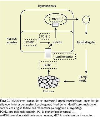 I forenklet form vises i Figur 1 nogle af de centre i hjernen, der er vigtige for appetitreguleringen. Selv om stimulation af forskellige hypotalamiske kerner er vist at kunne henholdsvis stimulere og hæmme fødeindtagelsen, synes nucleus arcuatus at være helt central for integrationen af de perifere signaler, der regulerer appetitten [3]. Den overordnede perifere regulator synes at være leptin. Leptin produceres i fedtvævet og er forhøjet i blodbanen ved overvægt og fedme. Højt leptinniveau stimulerer mæthedsfornemmelsen (den anorektiske pathway ) og hæmmer samtidig sultfornemmelsen (den oreksigene pathway ) i nucleus arcuatus. Det integrerede respons fra nucleus arcuatus overføres til hypothalamus specielt via melanocortin 4 receptoren (MC4R) (Figur 1). De væsentligste mediatorer for det integrerede leptinrespons er α-melanocytstimulerende hormon (MSH) (inducere mæthed ved at binde sig til MC4R), agouti-relateret peptid (inducere sult ved at blokere MC4R), ghrelin (et oreksigent hormon deriveret fra ventriklen) og neuropeptid Y (stimulerer sultfølelsen via interaktion med egne receptorer) [3]. MC4R spiller således en central rolle i forbindelse med at mediere og integrere perifere signaler, primært fra leptin, til appetitregulering i hypothalamus. I relation til ovennævnte system, er der i Figur 1 angivet de gener, i hvilke mutationer er vist at forårsage fedme.