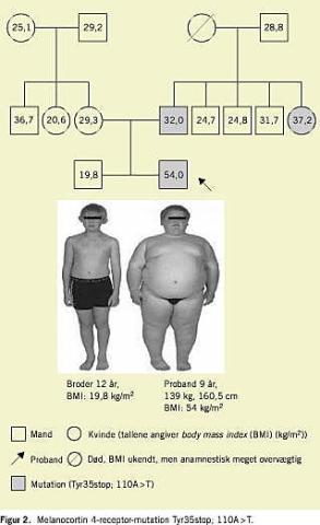 Den almindeligste monogenetiske årsag til svær fedme med debut i barndommen synes at være mutationer i MC4R -genet (prævalens ~ 2-6%) [4, 5], hvilket også er fundet i et dansk materiale (prævalens 2,8%) [6]. I Figur 2 vises et dansk eksempel på en mutation i MC4R -genet. Probanden er en dreng på ni år, henvist for svær fedme, der havde været til stede siden den tidligste barndom. Vægten på henvisningstidspunktet var 139 kg, svarende til et body mass index (BMI) på 54 kg/m 2. Probanden var født til tiden med en vægt på 3.550 g, men moderen bemærkede kort efter fødslen, at barnet virkede meget sultent, betydelig mere end storebroderen havde været. Barnet græd meget og blev uroligt, så snart han blevet taget fra brystet. Selv om drengens udvikling og intelligens var inden for det normale for aldersgruppen, blev han dog på baggrund af den svære overvægt flere gange i den tidlige barndom undersøgt for Prader-Willi-syndrom, uden at der på noget tidspunkt blev påvist kromosomforandringer. På baggrund af mistanken om en monogenetisk årsag til drengens svære overvægt blev han undersøgt for mutationer i MC4R -genet. Ved genetisk screening af probanden blev der fundet følgende mutation i MC4R -genet: Tyr35stop; 110A > T. Den efterfølgende familiescreening viste, at såvel faderen som en af dennes søskende også havde den samme mutation. Disse personer led alle af fedme, men i meget varierende grad, som det fremgår af Figur 2. Faderen havde således et BMI på 32,8 kg/m2 , og faderens søster med samme mutation havde et BMI på 37,8 kg/m2 . Probandens farmoder var død, men familien kunne oplyse, at farmoderen havde været svært overvægtig hele livet, og hendes søskende havde ligeledes været særdeles overvægtige, hvilket lader formode, at mutationen kommer fra farmoderens familie. Alle med mutationen i familien var heterozygote.