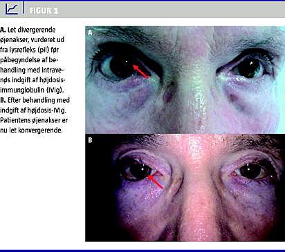 I løbet af de følgende år blev dobbeltsynet konstant, og efterhånden fik patienten behov for den størst mulige prismebrille, der dog ikke altid kunne korrigere dobbeltsynet. Patientens paræstesier og ledsagende balancebesvær var efter ca. otte år blevet invaliderende. Ved klinisk undersøgelse var der let divergerende øjenakser, tydelig usikkerhed ved linjegang, manglende dybe reflekser og nedsat stiksensibilitet på fødderne. En ny elektrofysiologisk undersøgelse viste nu tegn på en blandet sensorisk aksonal og demyeliniserende polyneuropati. Undersøgelsen viste reduceret amplitude af de sensoriske aktionspotentialer i n. ulnaris og n. suralis samt nedsat ledningshastighed og forlænget minimal F-wave-latens i bl.a. n. ulnaris. På baggrund af udvikling i tilstanden fandt man nu indikation for behandling med højdosis IVIg. Efter ca. fire måneders behandling med IVIg hver sjette uge var der en tydelig forbedring af symptomerne. Dobbeltsynet reduceredes, så patienten kunne nøjes med at anvende prisme 10 mod prisme 16 før behandlingen (Figur 1 ).