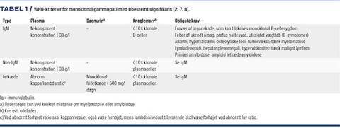 MGUS skal forstås som en tilstand med asymptomatisk og relativt lille M-komponent eller letkædeabnormitet defineret som vist i Tabel 1 [2, 3, 7, 8]. Diagnosen stilles ved udelukkelse af malign paraproteinæmi, dvs. i prioriteret rækkefølge: 1) Myelomatose: Når mængden af M-komponent eller monoklonale plasmaceller i knoglemarven overskrider grænserne for MGUS. Evt. med vævsskade i form af anæmi, nyresygdom, hyperkalcæmi og/eller osteolytiske skeletfoci. 2) Waldenströms makroglobulinæmi, som per definition har IgM-M-komponent. 3) Kronisk lymfatisk leukæmi (CLL) og andre non-Hodgkin-lymfomer: ca. 20% har M-komponent. 4) Solitært plasmacytom: isoleret plasmacelletumor. 5) Primær amyloidose (AL-amyloidose): Når monoklonale lette kæder aflejres ekstracellulært som amyloide fibriller, som kan medføre vævsskade. Alvorligst er nyresygdom og hjertesvigt, men alle organer kan rammes. Makroglossi (se efter tandmærker) og periorbital purpura (raccoon eyes) er patognomiske. Aflejringssygdomme med nonamyloide immunglobulinaflejringer ses sjældnere, men har fuldstændigt tilsvarende klinik. 6) Polyneuropati, organomegali, endokrinopati, monoklonal gammopati og hudforandringer (POEMS-syndrom): M-komponent og demyeliniserende polyneuropati er obligate krav; ofte ledsaget af osteosklerotiske foci. Dette syndrom forekommer sjældent. 7) Teleangiektasier, forhøjet erythropoietin med polycytæmi, monoklonal gammopati, perirenale væskeansamlinger og intrapulmonal shunt (TEMPI-syndrom). Dette syndrom forekommer ekstremt sjældent.