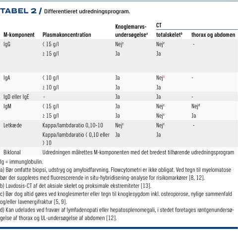 Blandt symptomfri patienter er det nemlig kun 5% af dem med IgG-M-komponent < 15 g/l, som har myelomatose. Tilsvarende ses osteolytiske læsioner kun hos hhv. 1% og 2% af patienterne med M-komponent af typen IgG < 15 g/l respektive IgA < 10 g/l [14].