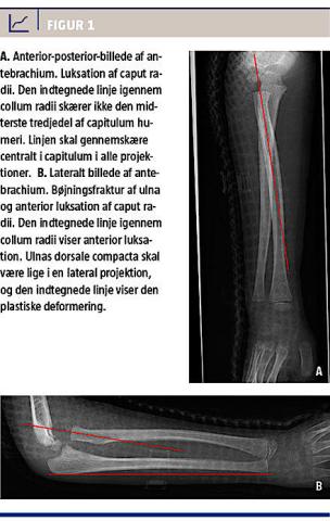 MF er relativt simpel at diagnosticere, hvis man er opmærksom på den beskrevne patologi. Ud fra AP-optagelsen alene kan diagnosen ikke stilles [3], hvorfor en lateral projektion, som inkluderer hele antebrachium, er indiceret. Ved MF hos børn ses der ofte ingen frakturlinje (Figur 1), og røntgenoptagelser af albuen i to planer eksklusive antebrachium kan derfor let misfortolkes som værende normale, trods tilstedeværelsen af MF. Røntgenoptagelse i to planer, hvor hele antebrachium er inkluderet, visualiserer luksationen af caput radii samt den ulnare bøjningsfraktur og er derfor essentiel for at stille diagnosen [3]. Hvis man indtegner to hjælpelinjer på røntgenbillederne, kan diagnosen nemt stilles. Indtegnes en længdeakse midt i collum radii, skal denne gennemskære den midterste tredjedel af capitulum humeri i alle projektioner. Endvidere skal ulnas dorsale compacta på en sand lateral optagelse være lige (Figur 1B). Diagnosticeres tilstanden ikke, vil barnet kunne opleve smerte, instabilitet, deformitet (cubitus valgus) samt tab af kraft og bevægelighed i albueleddet i sit voksenliv [4].