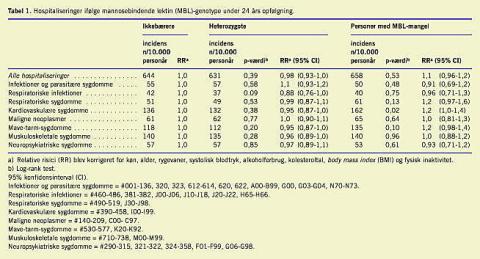 Da vi inddelte indlæggelsesdiagnoser i specifikke sygdomsgrupper [1], fandt vi, at incidensen af kardiovaskulære sygdomme pr. 10.000 personår var 162 hos personer med MBL-mangel (p = 0,02), 132 hos heterozygote personer (p = 0,38) og 136 hos ikkebærere (Tabel 1). Efter korrektion for potentielle konfoundere var den relative risiko for kardiovaskulære sygdomme hos personer med MBL-mangel og heterozygote personer sammenlignet med ikkebærere henholdsvis 1,2 (95% konfidensinterval: 1,0-1,4) og 0,95 (0,87-1,0); disse fund kunne dog ikke bekræftes i to store casekontrolstudier [17]. Der var ikke forskel imellem de tre MBL-genotyper i incidens af hospitalisering for infektioner eller andre alvorlige hyppigt forekommende sygdomme. På baggrund af yderligere inddeling af indlæggelsesdiagnoser fandt vi tendenser imod lavere incidens af cystitis og forøget incidens af kronisk obstruktiv lungesygdom, iskæmisk hjertesygdom, iskæmisk cerebrovaskulær sygdom og abort hos personer med MBL-mangel end hos ikkebærere (Tabel 2 ); der var dog ingen signifikante forskelle.