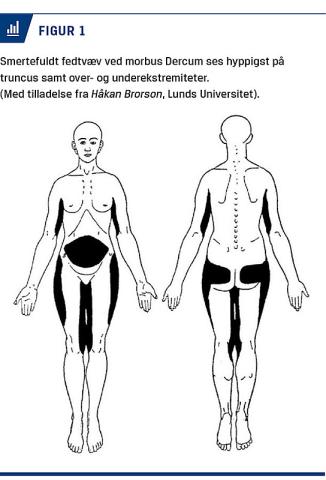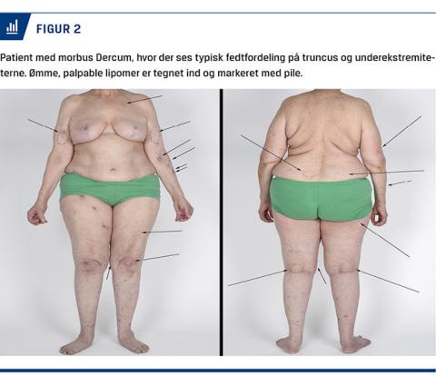Morbus Dercum (MD) er en smertefuld sygdom i fedtvævet og er beskrevet første gang i litteraturen af den amerikanske neurolog Francis Xavier Dercum i 1888 [1]. MD betegnes også som fedtvævsreumatisme, lipomatosis dolorosa eller adiposis dolorosa. MD er en tilstand, der er karakteriseret ved kroniske smerter, der er lokaliseret til patologisk fedtvæv og ses som subkutane lipomer af variabel størrelse, specielt i truncus og ekstremiteterne [2, 3] (Figur 1 og Figur 2).