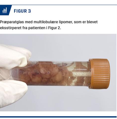 De kirurgiske behandlingsmuligheder består af åben eksstirpation (lipektomi) og fedtsugning. Ved begge metoder er recidivrisikoen høj, og der er ingen garanti for effekt på smerter. Eksstirpation af palpable lipomer sigter imod at fjerne fylde og lindre smerter, dog med risiko for recidiv i løbet af få måneder [4] (Figur 3). Lipektomi, hvor hud og subkutant væv excideres til fascieniveau, er beskrevet ved lednær MD til forbedring af mobiliteten og smertelindring [17].