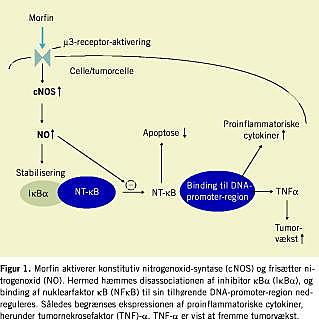 NO hæmmer binding af transkriptionsfaktor NFκB til DNA. Herved nedregulerer morfin ekspression af gener ansvarlige for produktion af proinflammatoriske cytokiner, herunder TNF-α, og stimulerer som tidligere beskrevet apoptose [1, 31] (Figur 1). Det er ligeledes påvist i andre studier, at NO-produktion er relateret til apoptose og nedsat karcinogenese [39]. Imidlertid har man i andre undersøgelser vist, at NO stimulerer proliferation af maligne celler, og dermed synes NO at spille en række modstridende roller i reguleringen af tumorvækst [40].