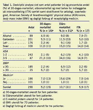 Resultater: I alt blev 290 patienter inkluderet. tredivedages- og etårsmortalitetsrisiko var henholdsvis 5% og 11% og uafhængig af ætiologi. American Society of Anesthesiologists' physical status (ASA)-score og sværhedsgrad af AP havde en signifikant effekt på 30-dages-mortalitetsrisiko (odds-ratio (OR): 9,2 for ASA-score > 2 og OR: 4,2 for svær grad af AP), mens dagligt forbrug af receptpligtig medicin og ASA-score havde en signifikant effekt på etårsmortalitetsrisiko (OR: 10,4 for brug af medicin og OR: 4,5 for ASA-score > 2). Svær grad af AP var en signifikant prognostisk faktor for behov for indlæggelse på en intensivafdeling (OR: 26,2) og for dagligt forbrug af receptpligtig medicin (OR: 7,3).