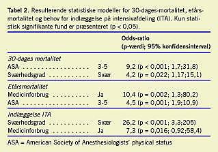 Ætiologi havde ikke signifikant effekt på mortalitetsrisiko eller behov for indlæggelse på ITA. Derimod var der en signifikant effekt på 30-dages-mortalitetsrisiko af ASA-score (OR = 9,2 for ASA-score > 2) og sværhedsgrad af AP (OR = 4,2 for svær AP). Hertil havde dagligt forbrug af receptpligtig medicin en signifikant effekt på etårsmortalitetsrisiko (OR = 10,4 for brug af medicin), ligesom ASA-score havde en signifikant effekt (OR = 4,5 for ASA-score > 2). Svær grad af AP var en signifikant prognostisk faktor for behov for indlæggelse på ITA (OR = 26,2), ligesom dagligt forbrug af receptpligtig medicin (OR = 7,3) (Tabel 2).