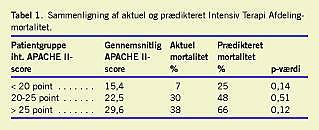 Af Tabel 1 fremgår den aktuelle ITA-mortalitet for tre patientgrupper inddelt efter deres APACHE II-score. Den prædikterede mortalitet er beregnet ud fra den gennemsnitlige APACHE II-score i gruppen.
