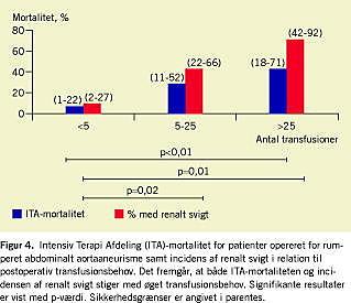 Det fremgår af Figur 4 , at ITA-mortaliteten øges i takt med det postoperative blodtab. Ved behov for mindre end fem transfusioner var ITA-mortaliteten 7%, hvilket er signifikant lavere end for gruppen med over 25 transfusioner (p = 0,01) hvor mortaliteten er 43%. Forekomsten af renalt svigt øgedes fra 10% til 71% med tiltagende postoperativ blødning. Forskellen imellem gruppen med under fem transfusioner og de to øvrige er signifikant (p = 0,02 og p < 0,01). En øget ITA-mortalitet ved øget præ- og peroperativ transfusionsbehov var ikke signifikant.