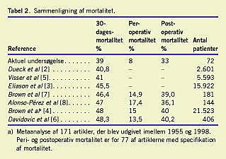 Mortaliteten fordelte sig således, at den peroperative mortalitet var 8% (6/72 patienter (pt.)) (KG 3,2-17,3). ITA-mortaliteten var 22% (14/65 pt.) (KG 12,3-33,5). Den postoperative mortalitet var 33% (22/66 pt.) (KG 22,2-46,0), mens 30-dages-mortaliteten var 39% (28/72 pt.) (KG 27,6-51,1).