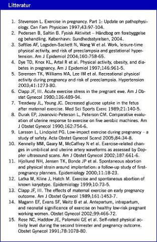 Undersøgelsens fund understøttes af en anden dansk kohorteundersøgelse, der konkluderede, at fysisk belastning omkring tidspunktet for implantation var associeret med en forøget risiko for spontan abort (HR = 2,5 (95% KI = 1,3-4,6) [11]. I modsætning hertil har man i et case control-studie fundet en beskyttende effekt af motion under graviditeten i forhold til spontan abort (OR = 0,5 (95% KI = 0,3-1,0)) [12]. Derudover blev der i et mindre prospektivt studie ikke fundet nogen forskel i risikoen for spontan abort blandt motionsløbere, aerobicdansere og en kontrolgruppe [13]. Endelig har to studier undersøgt sene spontane aborter [14, 15], og i overensstemmelse med vores resultater fandt de ingen sammenhæng mellem motion og spontan abort senere i graviditeten.