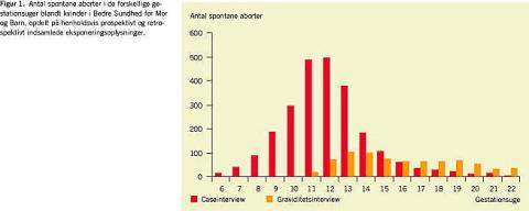 Af figuren (Figur 1) fremgår det, at case- interviewene blev foretaget hyppigere blandt de tidligste spontane aborter.