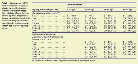 Den første del af tabellen (Tabel 1), som baserer sig på alle kvinderne, viser en øget risiko for spontan abort forbundet med tiltagende motionsmængde sammenlignet med kvinder, der ikke dyrkede motion. Det største risikoestimat ses for spontan abort i uge 11-14, hvor motion i mere end 419 min./ uge var forbundet med en næsten fire gange øget risiko for spontan abort (hazard ratio (HR) = 3,7 (95% konfidensinterval (KI) = 2,9-4,7)). Efter 18 gestationsuger fandt vi ingen sammenhæng mellem motion og spontan abort.