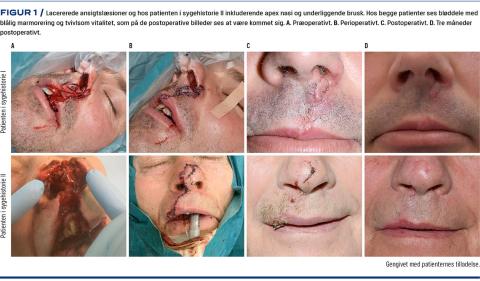 Begge patienter havde gennemgående, gabende og lacererede læsioner på overlæben (Figur 1) og blev tilset på skadestuen. Der var frie luftveje, ingen frakturer af ansigtsknogler eller tandskader, men patienten i sygehistorie II havde en læsion gennem columella og apex nasi til cavum nasi. Begge patienter blev sutureret i generel anæstesi af den plastikkirurgisk vagthavende. Læsionerne blev lukket lag for lag i dybden med resorberbar sutur og i huden med nonresorberbar sutur. De lacererede elementer blev benyttet i rekonstruktionen – intet blev skåret væk. Præ- og peroperativt var disse elementer blåligt marmoreret og havde tvivlsom vitalitet. Ved suturfjernelse var elementerne vitale, og de kosmetiske resultater var acceptable. Patienten i sygehistorie I fik let arhypertrofi, hvorfor han blev anbefalet silikoneplaster- og kompressionsbehandling.