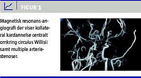 Udtrykket moyamoyasygdom blev første gang anvendt i 1969 [1]. Begrebet moyamoya betyder »røgsky/puff of smoke «, og det afspejler de karakteristiske forandringer, man finder ved MR-angiografi (Figur 1). Incidensen af sygdommen er i Japan under en pr. 100.000. I Europa er pålidelige epidemiologiske data ikke tilgængelige [1, 2]. Der skelnes mellem udtrykket moyamoyasygdom, som kendetegner den idiopatiske form af arteriopati, og moyamoyasyndrom, som betegner de tilfælde, hvor de karakteristiske angiografiske forandringer findes i forbindelse med anden patologi (f.eks. Downs syndrom, neurofibromatose og seglcelleanæmi) [1]. Sygdommen forekommer hyppigst hos kvinder. Debut af moyamoyasygdom i den asiatiske befolkning er bimodal med et tidligt højdepunkt i de første ti år af livet og et andet højdepunkt omkring 40-årsalderen. Den adulte form viser sig ofte i form af intracerebrale blødninger [1, 2], mens den juvenile form bl.a. manifesterer sig ved hovedpine, recidiverende transitoriske iskæmiske episoder med neurologiske udfald, bevægelsesforstyrrelser eller tilfælde med krampeanfald. Symptomerne opstår på baggrund af progredierende okklusion af de cerebrale arterier, som medfører kronisk iskæmi og leder til sekundær udvikling af kollaterale kar (Figur 1). Ætiologien er ukendt, men den progredierende okklusion af blodkar opstår som følge af en fibrotisk omdannelse af karrenes intima, som begynder i den distale del af arteria carotis med udbredelse til circulus arteriosus Willisii. Dette fører til progredierende stenosering af det vaskulære lumen. I ca. 10% af tilfældene begynder sygdommen unilateralt, og efter tre år har 75% bilaterale anfald [1].
