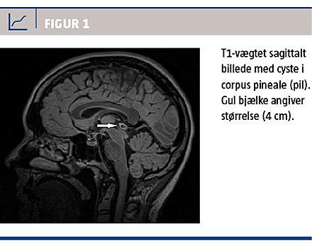 Cyster ses typisk som runde eller ovale og let hyperintense i forhold til cerebrospinalvæske (50-60%) på T1-vægtede skanninger (Figur 1), iso- eller let hyperintense og multicystiske med septae (20-25%) på T2-vægtede skanninger og moderat hyperintense på en fluid attenuated inversion recovery-sekvens [13, 17]. Den manglende blod-hjerne-barriere medfører opladning hos over 90% efter indgift af kontrast, ofte som en tynd randopladning, sjældnere som nodulær [10]. På grund af risiko for tryk på tectum, akvæduktstenose og hydrocefalus vil asymptomatiske, simpelt udseende cyster over 10 mm som regel blive kontrolleret i Danmark, mens grænsen i andre europæiske lande varierer fra 8 mm til 15 mm. Ved relevante symptomer som hovedpine eller ved fund af cyster med delvis solid opladning som udtryk for mulig neoplasi foretages der typisk klinisk og MR-skanningsopfølgning med kontrast i neuro-/onkologisk regi