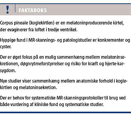 Tilgængeligheden af højopløselige MR-teknikker har ført til større opmærksomhed på og nye spørgsmål vedrørende corpus pineales (CP) funktion og kliniske betydning. Dertil kommer en stigende interesse for hormonet melatonins kliniske betydning og relation til forandringer i CP. I denne statusartikel fokuseres der på ikkeneoplastiske forandringer i CP, aktuel