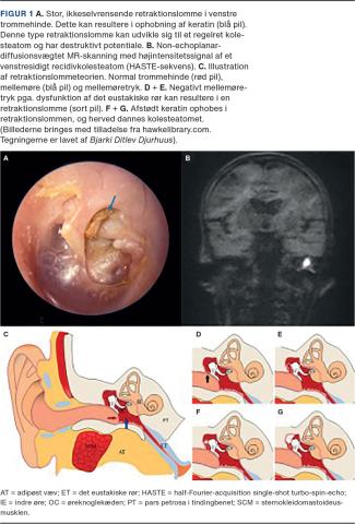 Patogenesen til kolesteatom har været diskuteret i lang tid. I dag klassificeres kolesteatomer som kongenitte, akkvisitte eller uklassificerbare. Et kongenit kolesteatom består af en voksende, medfødt cystisk masse indeholdende keratiniserende pladeepitel bag en intakt trommehinde [1]. Denne type er meget sjælden i Danmark. De akkvisitte kolesteatomer kan opdeles efter, om de er opstået ved akkumulation af keratin i en retraktionslomme (Figur 1A og C-G) eller ej [1]. I teorien om retraktionslommer, som formentlig er den hyppigste genese til kolesteatom, indgår dannelse af en retraktionslomme i trommehinden. Hvis lommen opnår en vis dybde, kan det afstødte keratin ikke passere ud, og der dannes et kolesteatom (Figur 1F-G). Teorien blev støttet af Tos et al [4, 5], som understregede betydningen af tubadysfunktion og negativt mellemøretryk i udviklingen af retraktionslommer [4, 6]. De akkvisitte kolesteatomer, som ikke opstår i en retraktionslomme, kommer ved indvækst af epitel gennem en perforation i trommehinden eller ved implantation af pladeepitel ved mellemørekirurgi [1].
