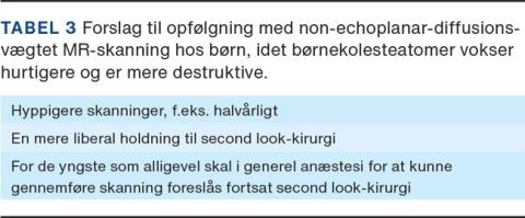 Da børnekolesteatomer er mere aggressive end voksenkolesteatomer [28], og da der tillige er større usikkerhed om validiteten af skanninger hos børn, foreslås det, at der foretages hyppigere skanninger, f.eks. hver sjette måned. Hos de yngste børn, som ikke kan medvirke til skanning uden at være i fuld narkose, kan second look-kirurgi fortsat være mest praktisk [16].