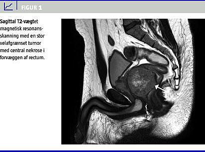En 39-årig mand blev henvist fra egen læge til udredning i rectumpakken, da han havde defækationssmerter, seks måneders tiltagende frisk blødning per rectum og en stor rektal tumor, der var fundet ved digital eksploration. På kirurgisk afdeling fandt man ved fleksibel sigmoideoskopi en rectumtumor, der blødte ved berøring og biopsitagning. Biopsien viste nekrotisk materiale. Magnetisk resonans (MR)-skanning af det lille bækken viste 5,5 cm oppe på forvæggen af rectum en velafgrænset ekstraluminal tumor på 7 cm i diameter. Tumoren var hyperintens på T2-vægtede sekvenser (Figur 1 ) og således ikke karakteristisk for det hypointense adenokarcinom, hvorfor GIST blev anført som differentialdiagnose. En transrektal ultralydskanning viste en hyperekkoisk tumor med central nekrose. Computertomografi (CT) af thorax og abdomen med intravenøst kontraststof viste ingen metastaser. Der blev ikke påvist patologisk udseende lymfeknuder ved hverken transrektal ultralydskanning, MR-skanning eller CT. Fornyet endoskopisk biopsi viste en tencellet tumor med positiv immunhistokemisk farvning for CD117 (kit-tyrosinkinase) og CD34, hvilket er diagnostisk for GIST. Der var højst en mitose pr. ti high power field (HPF). Patienten blev overflyttet til Odense Universitetshospital, hvor han undergik komplet kirurgisk resektion med frie resektionsrande og fik udført permanent kolostomi. I præparatet var der to mitoser pr. 50 HPF. En mutationanalyse viste mutation i kit-exon 11. Tumoren blev klassificeret som intermediær risiko. Der blev ikke givet nogen efterbehandling. Der blev planlagt opfølgende kontrol med CT af thorax og abdomen hvert halve år.